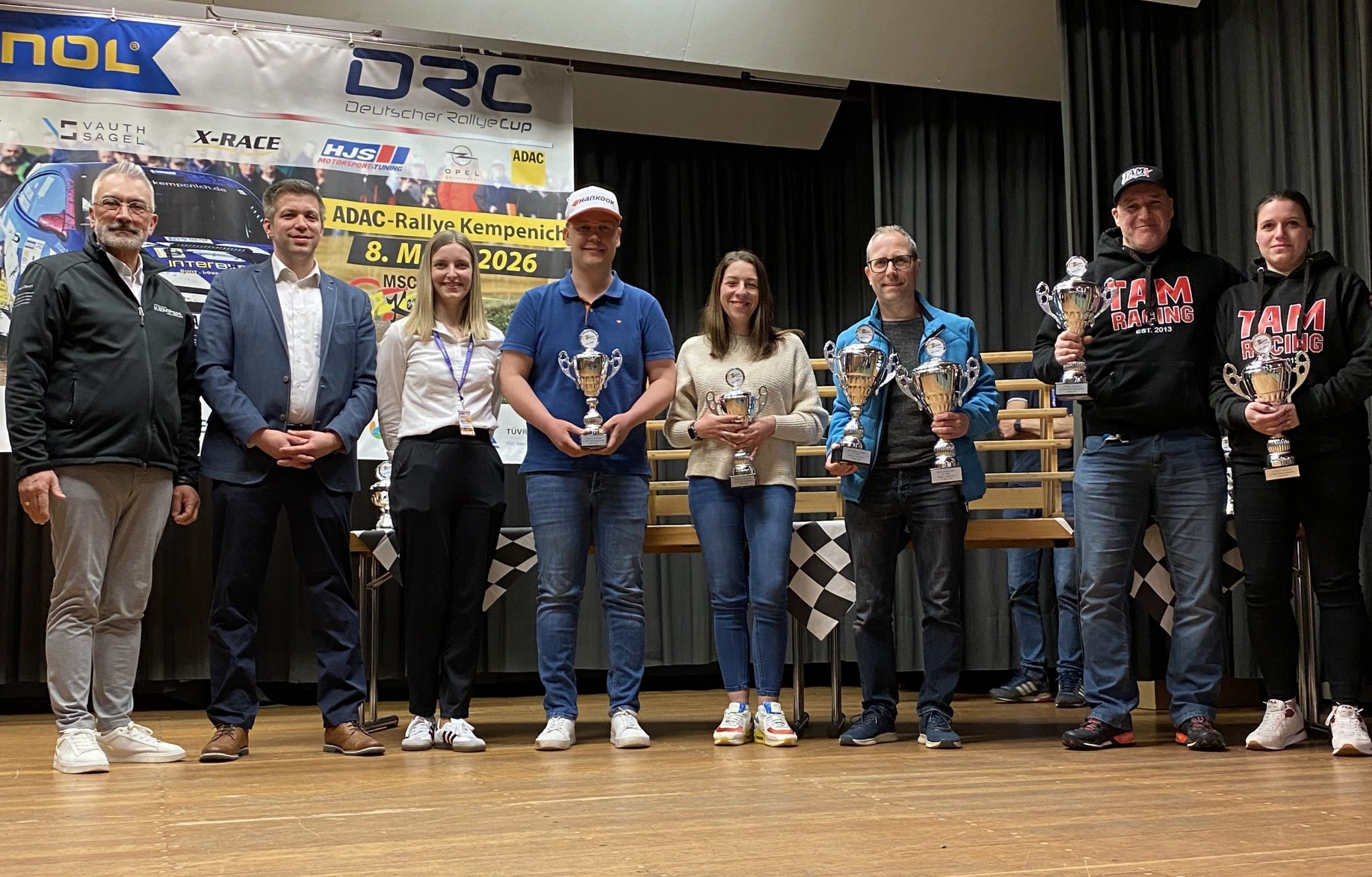 2. Im Bild von links: Andreas Molitor, Hauptsponsor Autohaus Kempen, Matthias Koslowski für die Gemeinde Kempenich, Jessica Nett (Orga-Leitung), Team Max Reiter/Conny Nemenich (3. Platz), Stefan Kopzyk als Beifahrer für das Gesamtsieger-Team mit Fahrer Dennis Rostek und Team Christopher Gerhard/Lena März (2. Platz).
